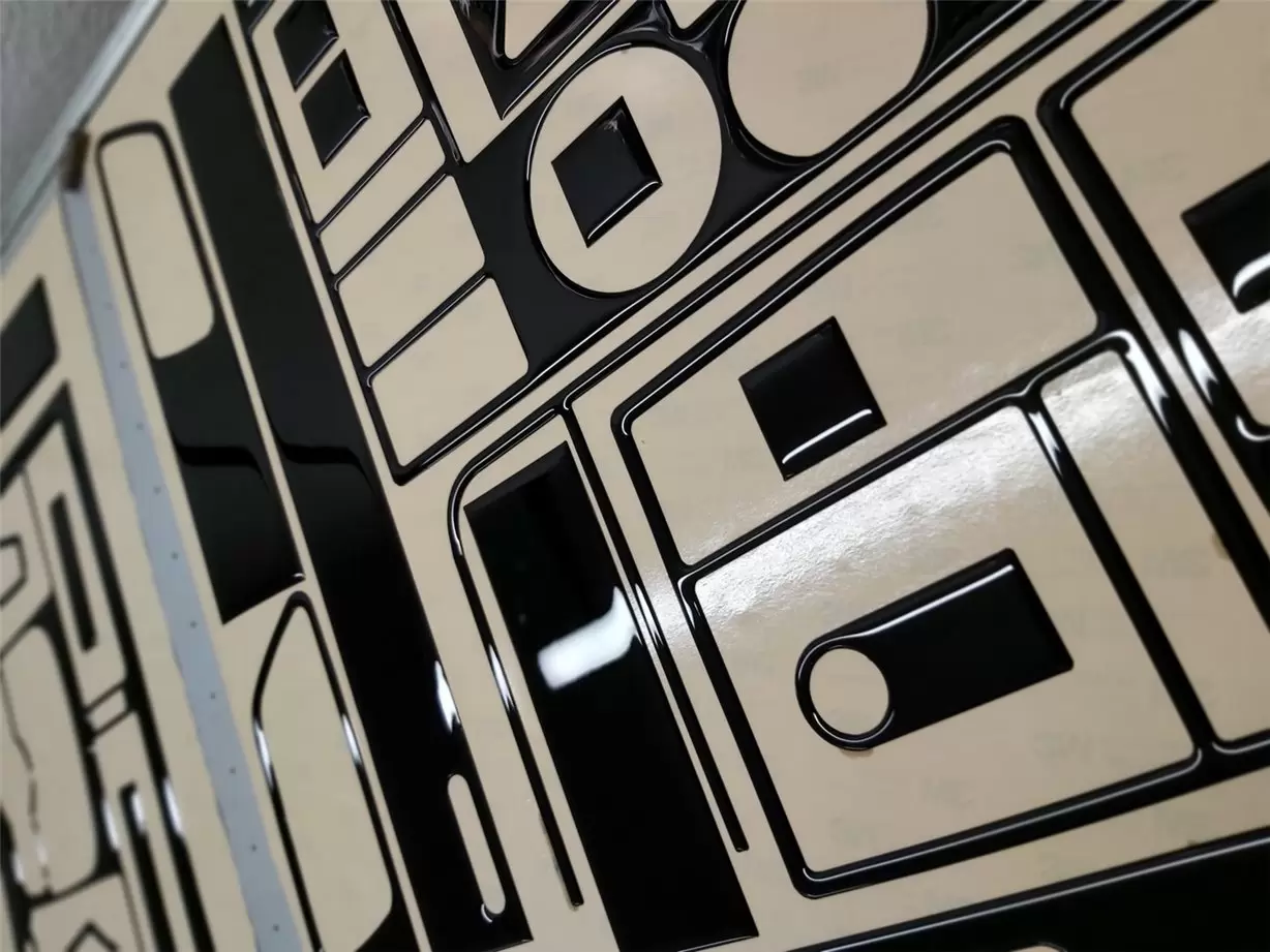 AutoDekor pour clear coat over cutouts to allow backlit factory symbols to shine through (ie. “PWR” on a radio), creating a smooth surface & clean look.